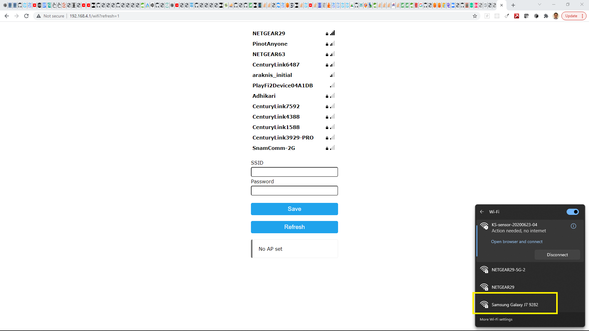 Scanning of WiFi SSID does not show my Android HotSpot, Samsung Galaxy J7 9282. It is set to 2.4Gh. I've attached a screen shot that shows that the laptop can see that hotspot just fine, but it is not on the list, after many refreshes.