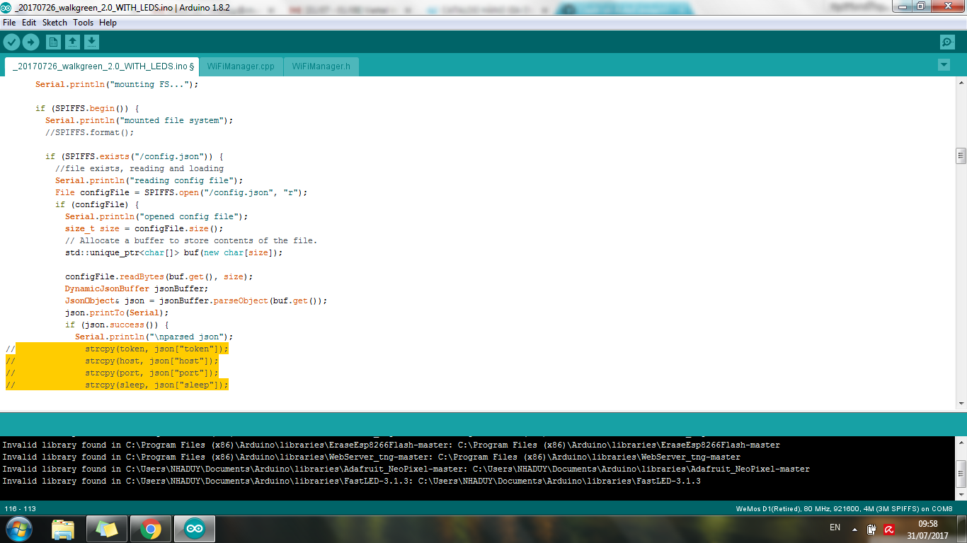 Step 2: Then you will get no error any more, get into the WiFi Configuration and add values for 4 parameters. Check if the FS is saved all parameter or not. But this time when you reset the ESP it will not read the 4 parameters because you have commented the 4 lines above.