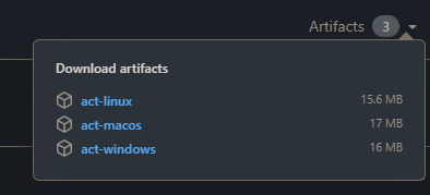 Checkstab on this PR or go to https://github.com/nektos/act/pull/574/checksClick the Artifacts button in the upper right