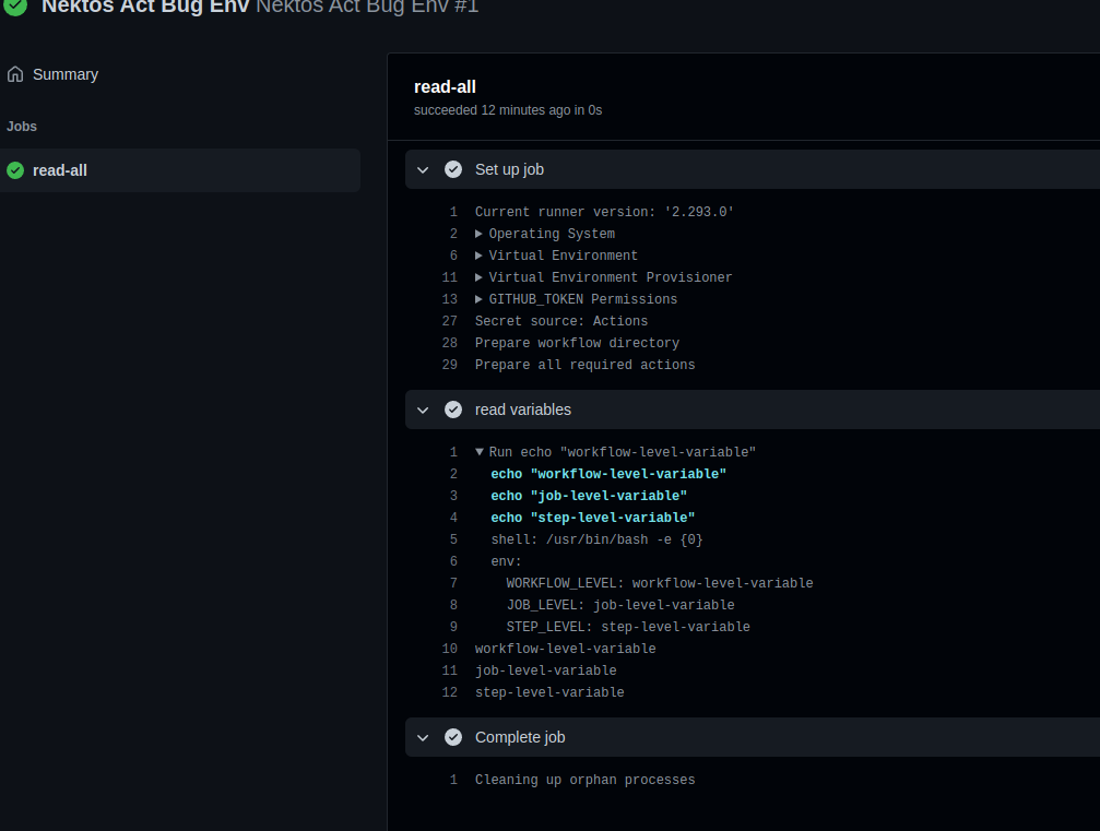 envportion of the step are not populated, theenvportions of workflow and job seems to be working just fine. Below is the workflow and here is the outputs. First one from ACT and second one from GitHubYou can see that on ACT step-variable is missing.