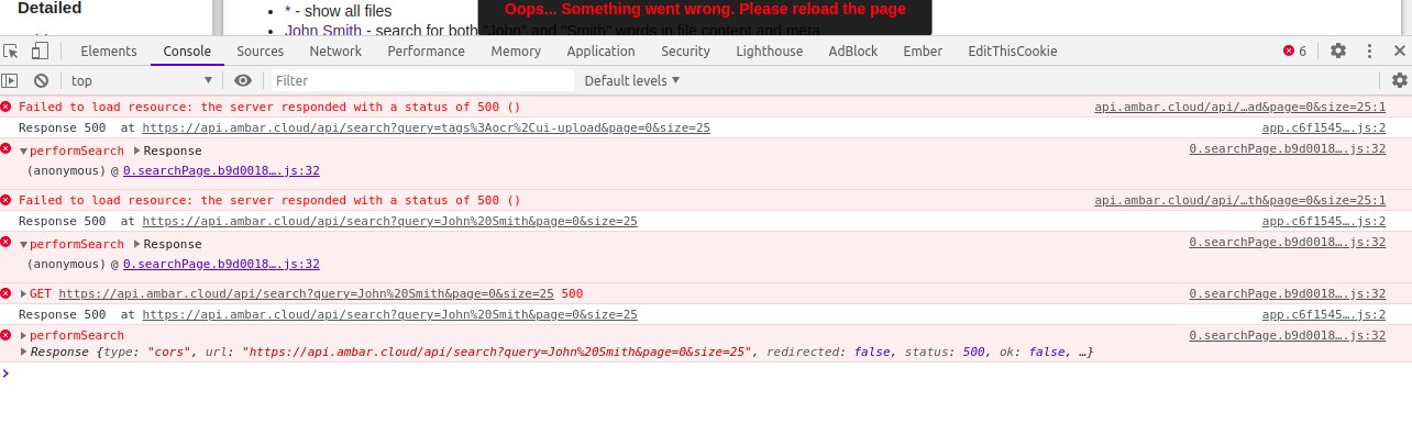 If I upload a document, I get an error. Same when I try to search. Here's a console screenshot
