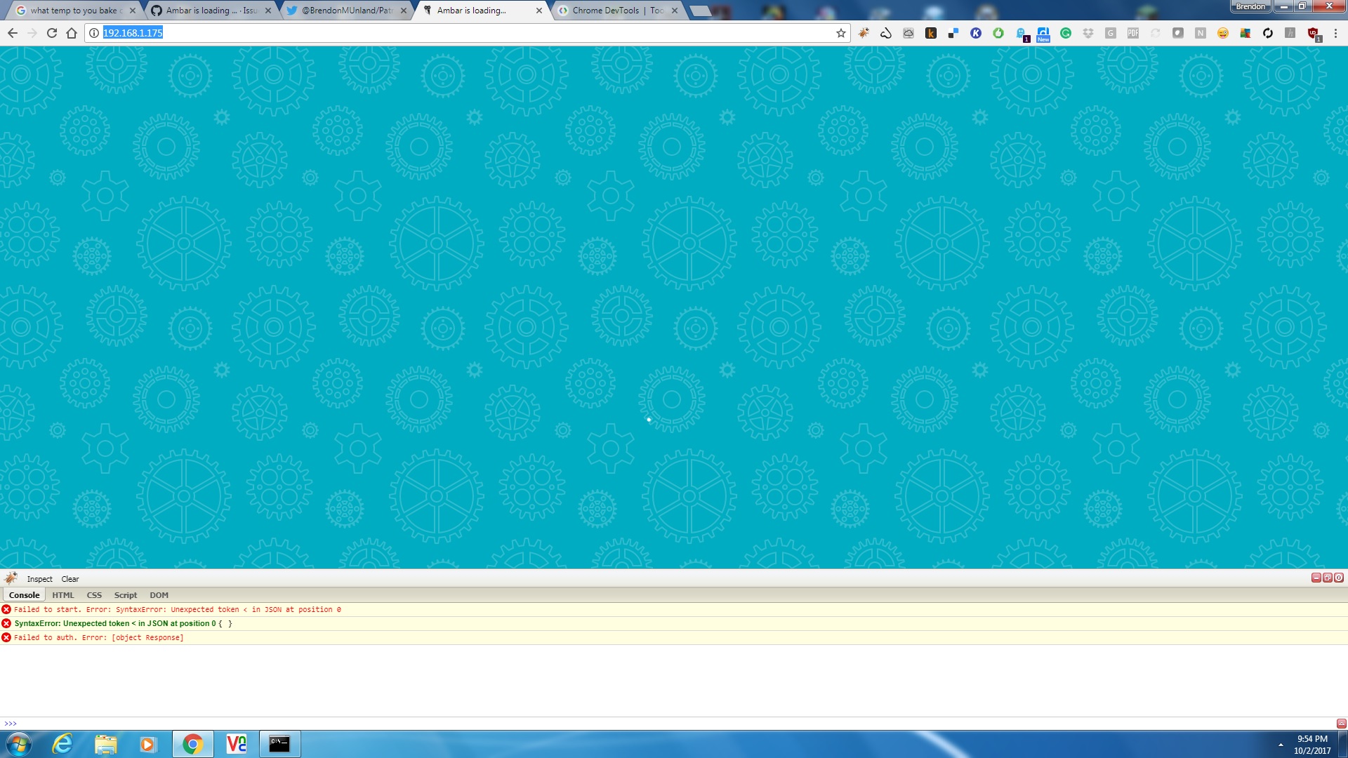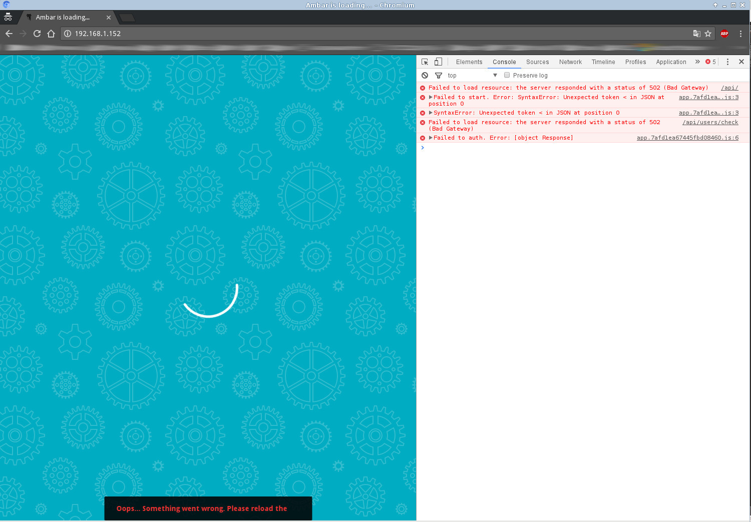 VM111:1 GET http://10.0.0.1:8081/api/ 502 (Bad Gateway) (anonymous) @ VM111:1 (anonymous) @ app.e102917ba60db91d4fa5.js:5 t @ app.e102917ba60db91d4fa5.js:5 x @ app.e102917ba60db91d4fa5.js:5 (anonymous) @ app.e102917ba60db91d4fa5.js:5 app.e102917ba60db91d4fa5.js:5 Failed to start. Error: SyntaxError: Unexpected token < in JSON at position 0 (anonymous) @ app.e102917ba60db91d4fa5.js:5 Promise rejected (async) (anonymous) @ app.e102917ba60db91d4fa5.js:5 (anonymous) @ app.e102917ba60db91d4fa5.js:52 (anonymous) @ vendor.728b3b1c29700b90277d.js:5 value @ app.e102917ba60db91d4fa5.js:28 e.notifyAll @ app.e102917ba60db91d4fa5.js:27 close @ app.e102917ba60db91d4fa5.js:51 closeAll @ app.e102917ba60db91d4fa5.js:7 perform @ app.e102917ba60db91d4fa5.js:7 perform @ app.e102917ba60db91d4fa5.js:7 perform @ app.e102917ba60db91d4fa5.js:5 C @ app.e102917ba60db91d4fa5.js:5 closeAll @ app.e102917ba60db91d4fa5.js:7 perform @ app.e102917ba60db91d4fa5.js:7 batchedUpdates @ app.e102917ba60db91d4fa5.js:28 l @ app.e102917ba60db91d4fa5.js:5 r @ app.e102917ba60db91d4fa5.js:8 enqueueSetState @ app.e102917ba60db91d4fa5.js:8 r.setState @ vendor.728b3b1c29700b90277d.js:2 (anonymous) @ vendor.728b3b1c29700b90277d.js:5 (anonymous) @ vendor.728b3b1c29700b90277d.js:2 (anonymous) @ vendor.728b3b1c29700b90277d.js:2 r @ vendor.728b3b1c29700b90277d.js:2 (anonymous) @ vendor.728b3b1c29700b90277d.js:2 (anonymous) @ app.e102917ba60db91d4fa5.js:29 window.webpackJsonp @ vendor.728b3b1c29700b90277d.js:1 (anonymous) @ 2.searchPage.37654496fa9353ee17be.js:1 app.e102917ba60db91d4fa5.js:5 SyntaxError: Unexpected token < in JSON at position 0 at app.e102917ba60db91d4fa5.js:5 at <anonymous> o @ app.e102917ba60db91d4fa5.js:5 (anonymous) @ app.e102917ba60db91d4fa5.js:5 Promise rejected (async) (anonymous) @ app.e102917ba60db91d4fa5.js:5 (anonymous) @ app.e102917ba60db91d4fa5.js:52 (anonymous) @ vendor.728b3b1c29700b90277d.js:5 value @ app.e102917ba60db91d4fa5.js:28 e.notifyAll @ app.e102917ba60db91d4fa5.js:27 close @ app.e102917ba60db91d4fa5.js:51 closeAll @ app.e102917ba60db91d4fa5.js:7 perform @ app.e102917ba60db91d4fa5.js:7 perform @ app.e102917ba60db91d4fa5.js:7 perform @ app.e102917ba60db91d4fa5.js:5 C @ app.e102917ba60db91d4fa5.js:5 closeAll @ app.e102917ba60db91d4fa5.js:7 perform @ app.e102917ba60db91d4fa5.js:7 batchedUpdates @ app.e102917ba60db91d4fa5.js:28 l @ app.e102917ba60db91d4fa5.js:5 r @ app.e102917ba60db91d4fa5.js:8 enqueueSetState @ app.e102917ba60db91d4fa5.js:8 r.setState @ vendor.728b3b1c29700b90277d.js:2 (anonymous) @ vendor.728b3b1c29700b90277d.js:5 (anonymous) @ vendor.728b3b1c29700b90277d.js:2 (anonymous) @ vendor.728b3b1c29700b90277d.js:2 r @ vendor.728b3b1c29700b90277d.js:2 (anonymous) @ vendor.728b3b1c29700b90277d.js:2 (anonymous) @ app.e102917ba60db91d4fa5.js:29 window.webpackJsonp @ vendor.728b3b1c29700b90277d.js:1 (anonymous) @ 2.searchPage.37654496fa9353ee17be.js:1 VM111:1 GET http://10.0.0.1:8081/api/users/check 502 (Bad Gateway) (anonymous) @ VM111:1 (anonymous) @ app.e102917ba60db91d4fa5.js:6 t @ app.e102917ba60db91d4fa5.js:5 p @ app.e102917ba60db91d4fa5.js:6 (anonymous) @ app.e102917ba60db91d4fa5.js:6 (anonymous) @ app.e102917ba60db91d4fa5.js:52 (anonymous) @ vendor.728b3b1c29700b90277d.js:5 value @ app.e102917ba60db91d4fa5.js:28 e.notifyAll @ app.e102917ba60db91d4fa5.js:27 close @ app.e102917ba60db91d4fa5.js:51 closeAll @ app.e102917ba60db91d4fa5.js:7 perform @ app.e102917ba60db91d4fa5.js:7 perform @ app.e102917ba60db91d4fa5.js:7 perform @ app.e102917ba60db91d4fa5.js:5 C @ app.e102917ba60db91d4fa5.js:5 closeAll @ app.e102917ba60db91d4fa5.js:7 perform @ app.e102917ba60db91d4fa5.js:7 batchedUpdates @ app.e102917ba60db91d4fa5.js:28 l @ app.e102917ba60db91d4fa5.js:5 r @ app.e102917ba60db91d4fa5.js:8 enqueueSetState @ app.e102917ba60db91d4fa5.js:8 r.setState @ vendor.728b3b1c29700b90277d.js:2 a.handleChange @ vendor.728b3b1c29700b90277d.js:4 f @ vendor.728b3b1c29700b90277d.js:3 (anonymous) @ vendor.728b3b1c29700b90277d.js:5 (anonymous) @ app.e102917ba60db91d4fa5.js:52 dispatch @ vendor.728b3b1c29700b90277d.js:5 (anonymous) @ app.e102917ba60db91d4fa5.js:5 Promise rejected (async) (anonymous) @ app.e102917ba60db91d4fa5.js:5 (anonymous) @ app.e102917ba60db91d4fa5.js:52 (anonymous) @ vendor.728b3b1c29700b90277d.js:5 value @ app.e102917ba60db91d4fa5.js:28 e.notifyAll @ app.e102917ba60db91d4fa5.js:27 close @ app.e102917ba60db91d4fa5.js:51 closeAll @ app.e102917ba60db91d4fa5.js:7 perform @ app.e102917ba60db91d4fa5.js:7 perform @ app.e102917ba60db91d4fa5.js:7 perform @ app.e102917ba60db91d4fa5.js:5 C @ app.e102917ba60db91d4fa5.js:5 closeAll @ app.e102917ba60db91d4fa5.js:7 perform @ app.e102917ba60db91d4fa5.js:7 batchedUpdates @ app.e102917ba60db91d4fa5.js:28 l @ app.e102917ba60db91d4fa5.js:5 r @ app.e102917ba60db91d4fa5.js:8 enqueueSetState @ app.e102917ba60db91d4fa5.js:8 r.setState @ vendor.728b3b1c29700b90277d.js:2 (anonymous) @ vendor.728b3b1c29700b90277d.js:5 (anonymous) @ vendor.728b3b1c29700b90277d.js:2 (anonymous) @ vendor.728b3b1c29700b90277d.js:2 r @ vendor.728b3b1c29700b90277d.js:2 (anonymous) @ vendor.728b3b1c29700b90277d.js:2 (anonymous) @ app.e102917ba60db91d4fa5.js:29 window.webpackJsonp @ vendor.728b3b1c29700b90277d.js:1 (anonymous) @ 2.searchPage.37654496fa9353ee17be.js:1 app.e102917ba60db91d4fa5.js:6 Failed to auth. Error: [object Response]What's strange is that I had it working on this machine before. I must have messed something up in there.