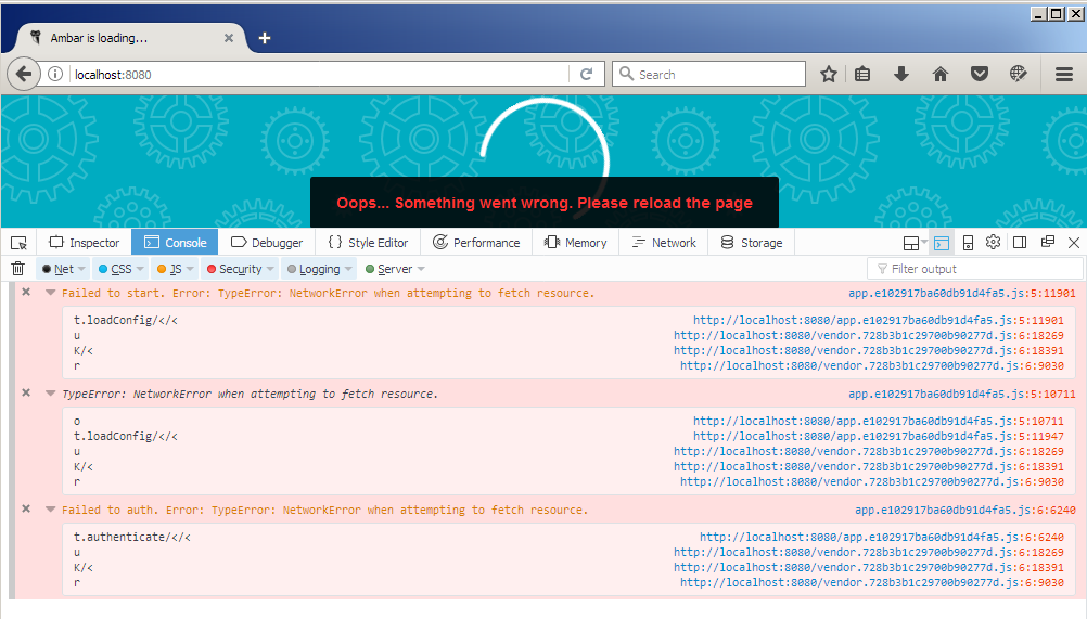 However, I got "Ambar is loading..." "Oops something went wrong" message.
