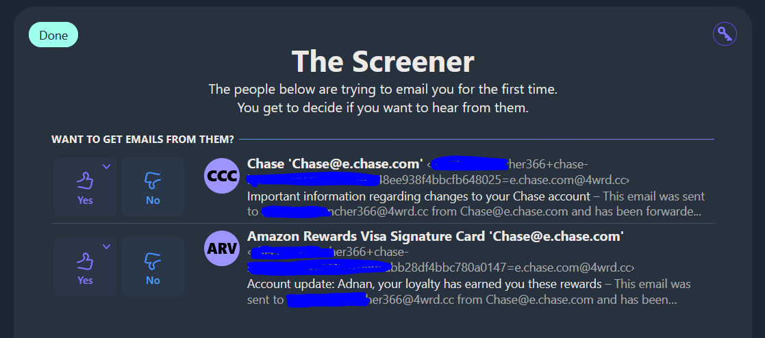 have to screen every email sent from them. Here is an example of two emails from chase that are waiting to be screened, even though i've already screened that email in the past, and they are showing as coming from two different senders.