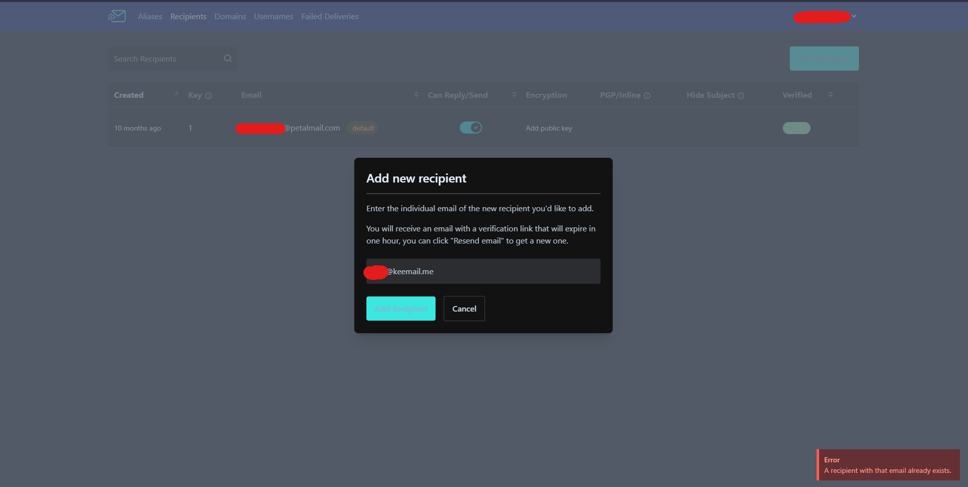 [GH-ISSUE #432] "A recipient with that email already exists" while trying to add new recipient #320