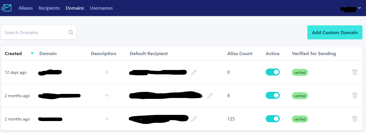 The 8 aliases that are left are used with a different custom domain and are pointing to the recipient with key 2, which shows 0 aliased in the first screenshot.
