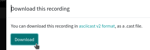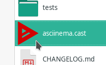 application/x-asciicastMIME-Type. This enables adding a.desktop-file to open asciinema.cast-files from within a file manager. By double-clicking a.cast-file, the default terminal will open and play the recording.The web browser will also allow opening a downloaded