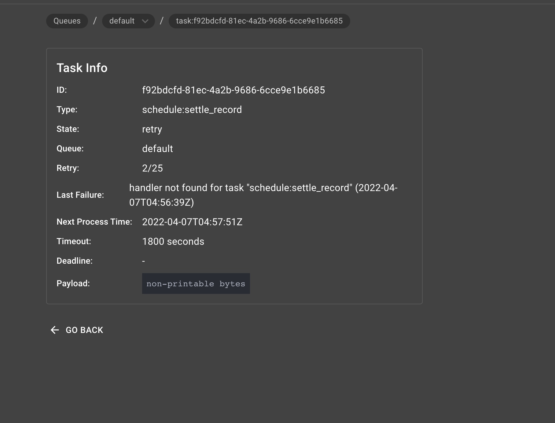 I started a once-a-minute execution of the scheduler, the execution succeeded several times will occasionally fail, the failure rate is very high, failure when the asynq handler is not called, failure web ui prompt "handler not found for task", if really handler is not configured that every time should not be executed successfully, but this is an occasional failure, can not understand. I configured scheduler, asynq handler server failure callbacks, but will not be triggered, but only in the web ui and redis on the number of failures increased, this is why, thank you for your reply