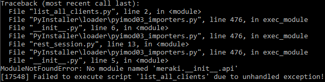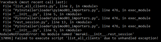 pyinstaller --noconfirm --onefile --console --no-embed-manifest --paths "path/to/lib/meraki" "path/to/file/list_all_clients.py"without success. Same for the hidden imports.I don't know if I gave enough information to try to debug.