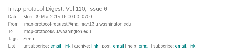 We now will display a "List" header with links to subscribe/post/archive/etc depending on what headers were in the message. Actions are either "email" that will load the compose page with the values for that action, or "link" entries that link to an external webpage to perform the action.