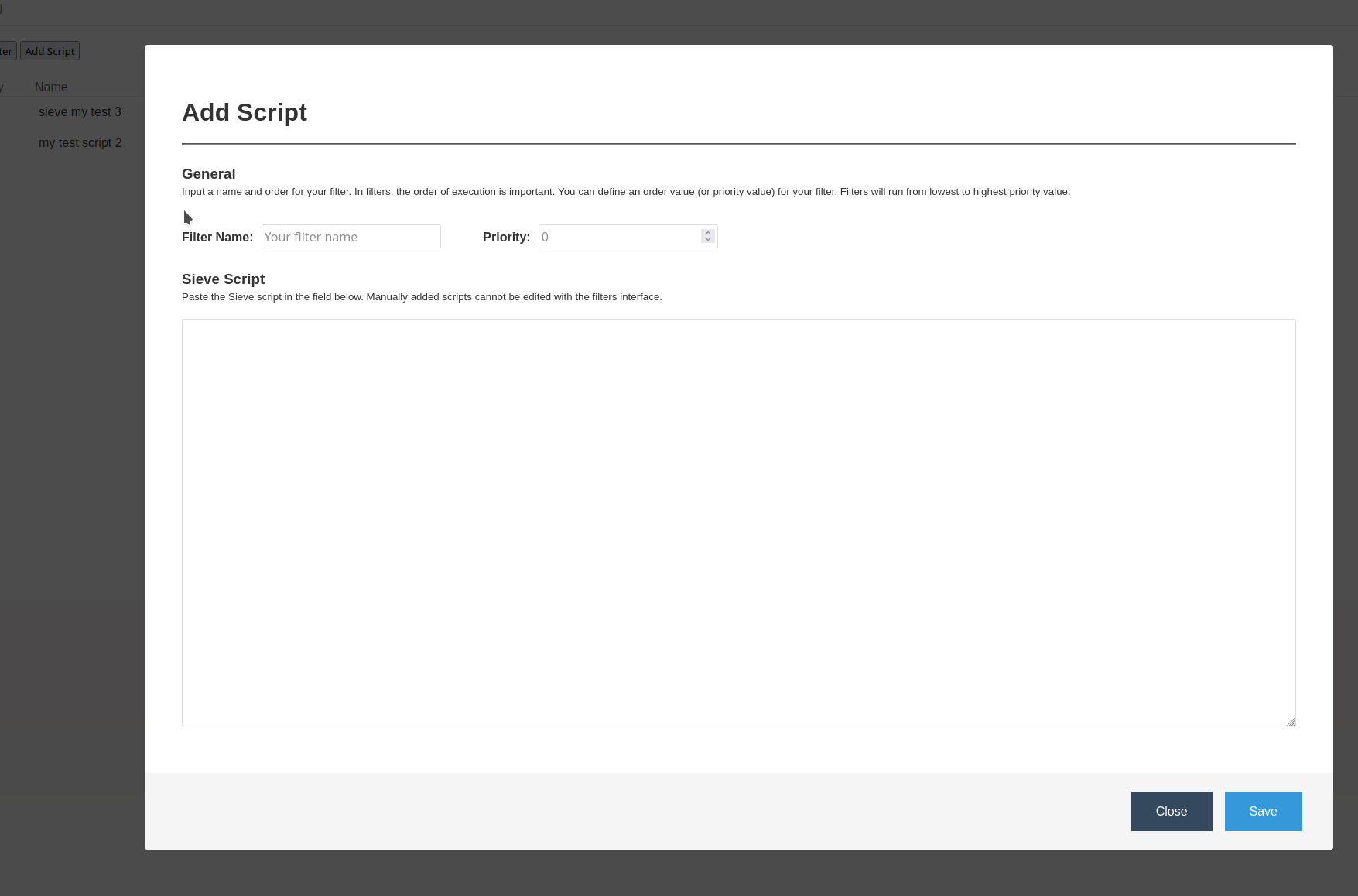d6191bfSieve configuration for the IMAP accounts43d00afHM3 config file sieve moduleb51830cUpdated composer.json with Sieve dependencies9c6767cSieve Module base script manager37b3ef4Final version of the script editor with priority and real time communication with sievee7a9cdaTingle modal library and config gen update66c3664Merge branch 'master' into sieve-modulea1e7e3fIMAP update for sieve configuration783b64aMerge remote-tracking branch 'origin/sieve-module' into sieve-moduleecbc061Change ELSE condition location📊 Changes