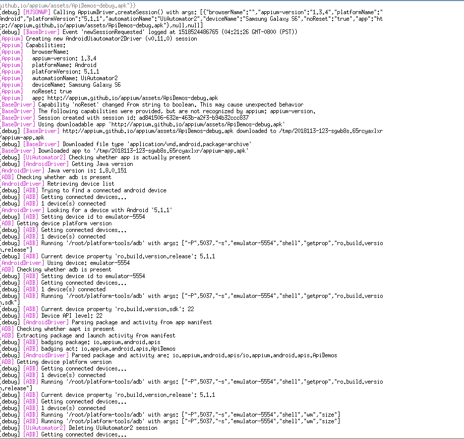 exports.android19 = { browserName: '', 'appium-version': '1.3.4', platformName: 'Android', platformVersion: '5.1.1', automationName: 'UiAutomator2', deviceName: 'Samsung Galaxy S6', noReset: 'true', app: undefined // will be set later };And full log:
