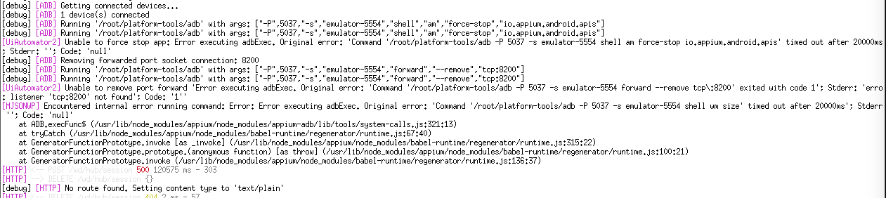 ERROR: An unknown server-side error occurred while processing the command. Original error: Error getting device API level. Original error: Error executing adbExec. Original error: 'Command '/root/platform-tools/adb -P 5037 -s emulator-5554 shell getprop ro.build.version.sdk' timed out after 20000ms'; Stderr: ''; Code: 'null'@butomo1989 i will try to use solution 2 , hope it works fine.