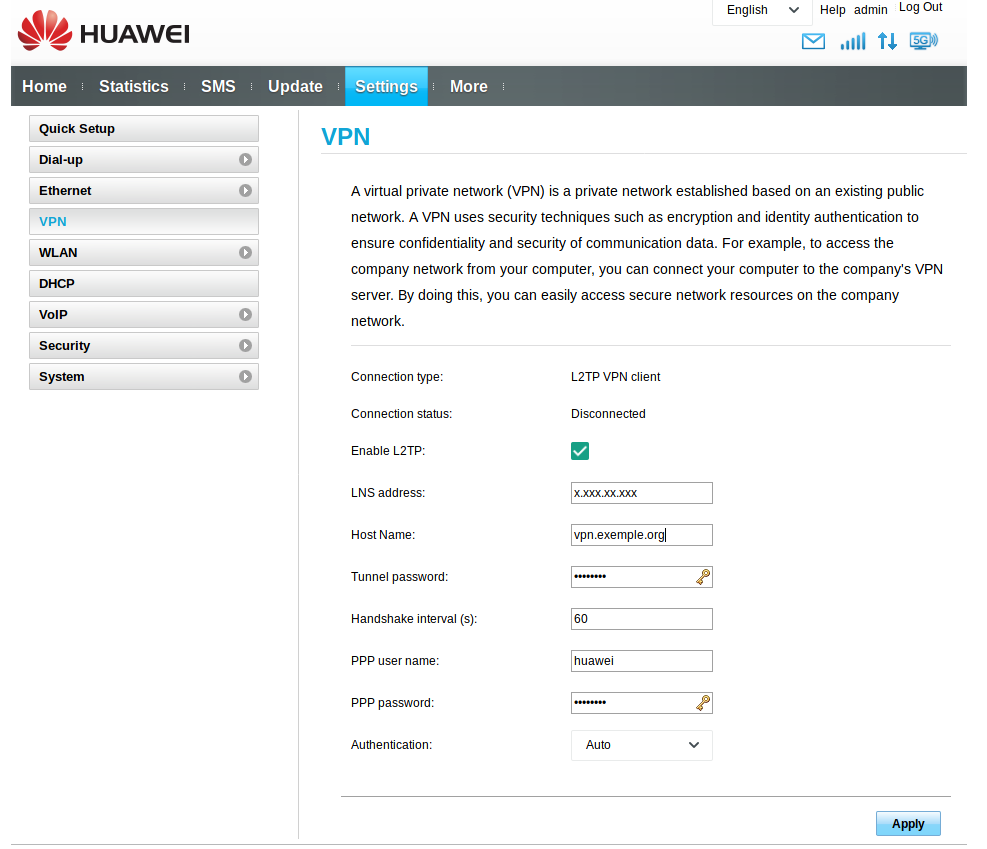 But when i enter the parameters in the interface of Huawei, the VPN remains on disconnect:
