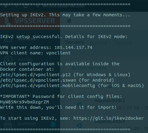 @dsmh Hello! The password for client config files was removed in [1] in an effort to simplify the IKEv2 config import process. If no password is displayed in the output, then you do not need to enter a password when importing to client devices. Note: For Windows clients, press Enter if prompted for the password, or leave the password field blank.