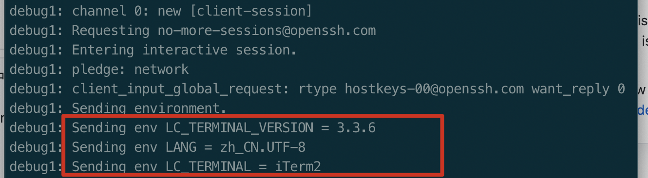 在terminal中使用ssh 命令连接时,会带上语言等信息,如下: