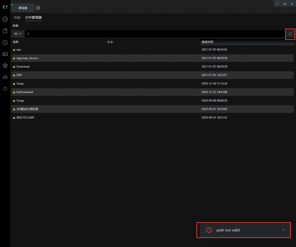 还有个小问题,本地根目录文件夹点击刷新按钮的时候 会提示 path not valid