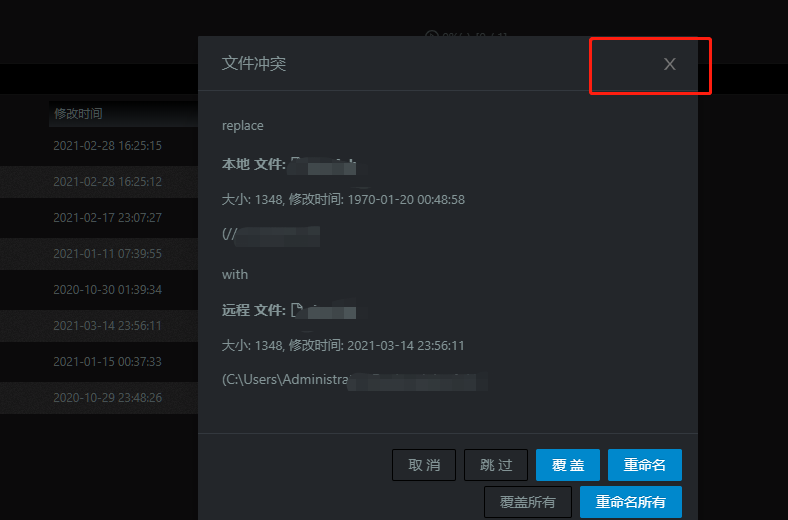 文件冲突提示框的关闭窗口按钮无线
