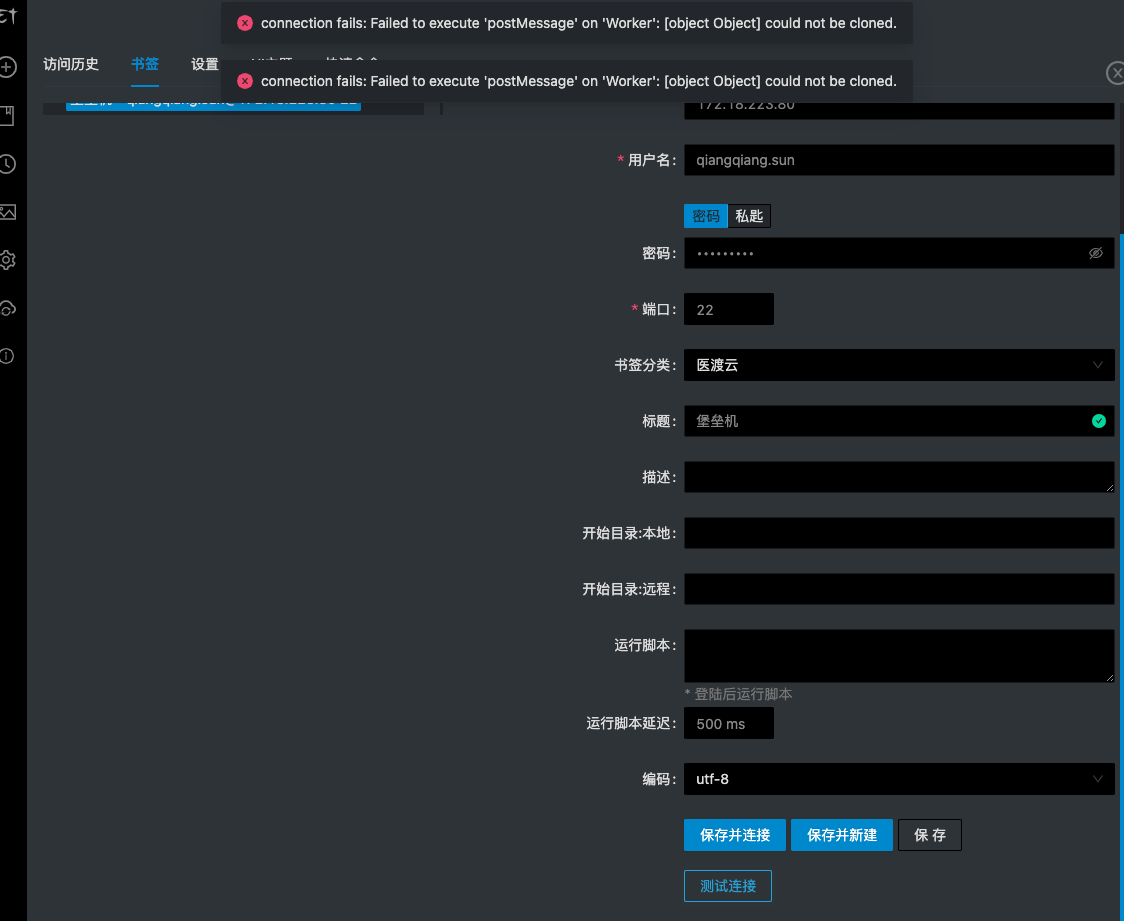 填写ssh信息,然后点击测试链接,但不影响保存和使用,但使用时还是会报这个错