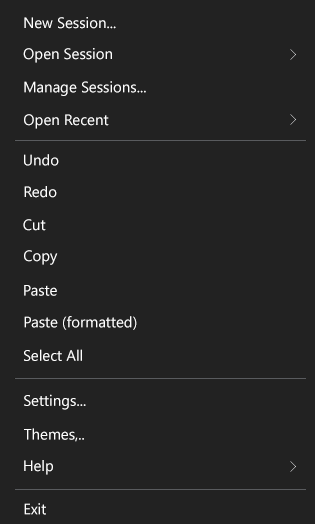 When clicking on the Electerm Icon, you would get a context menu like so (inspired by VS Code). How this menu works is pretty obvious: