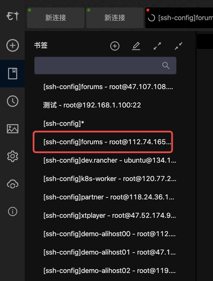 ssh forums即可连接主机在 Electerm 的书签中可以看到有对应的主机,但是点击连接将会报错
