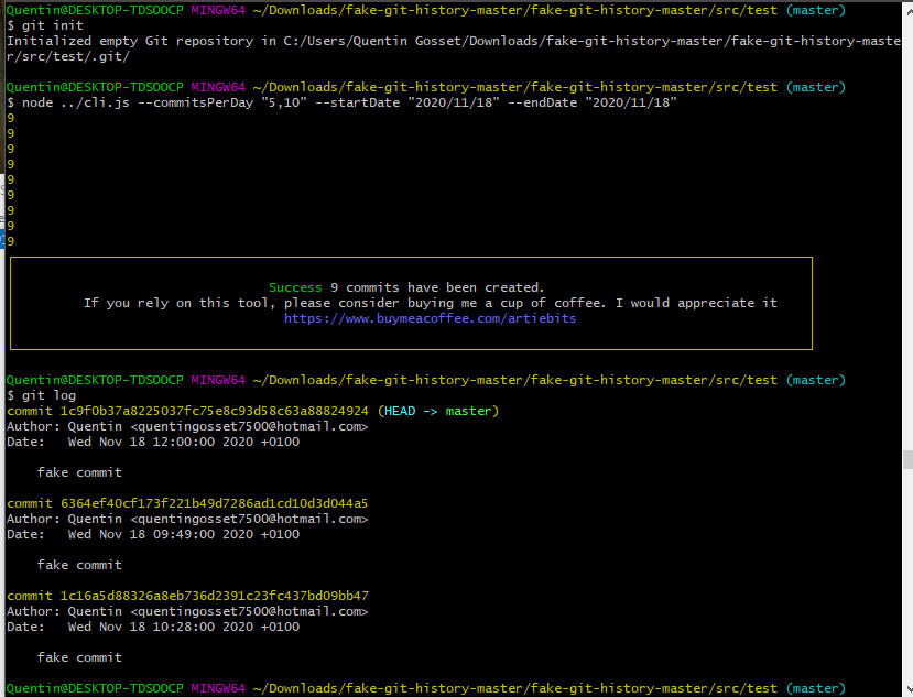 I don't know why I had this problem, but I noticed that I always had a limit of 1 to 3 commits for each day using the --commitsPerDay option "5,10" (see screen) however in the debug the value commitsPerDay was always higher than 3 and in the commit creation loop there were the X commits sent. however during a "git log" only 3 commits maximum per day were present. So I suspect a problem with the exec() and the waiting of 150. I solved the problem by using an exec in Promise mode.