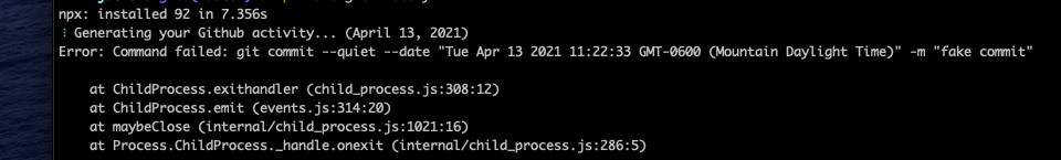 npx fake-git-historyhangs after making some commits.To Reproduce
