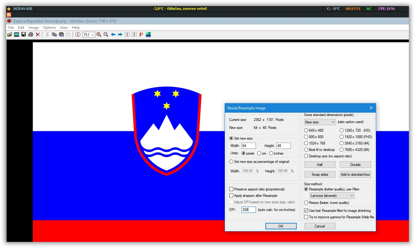 I changed the size of the PNG Slovenian flag in the 2362x1181 PNG format to 64x48 and the result is definitely the best compared to some other graphic editors. I am attaching the resulting PNG flag.