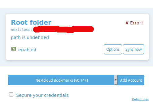 Wow, another error. Cryptic message alas. Was synching fine, but today I updated my Bookmarks app on Nextcloud to 0.15.1 as per a notification request, and the NextCloud itself to NexCloudPi v0.67.8 and NextCloud 14.0.4.2. And Now I see this error: