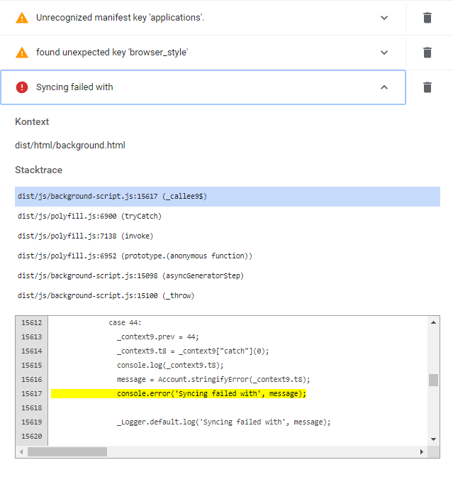 Chrome shows errors on the extension page if debuging and error loging for floccus is activated.
