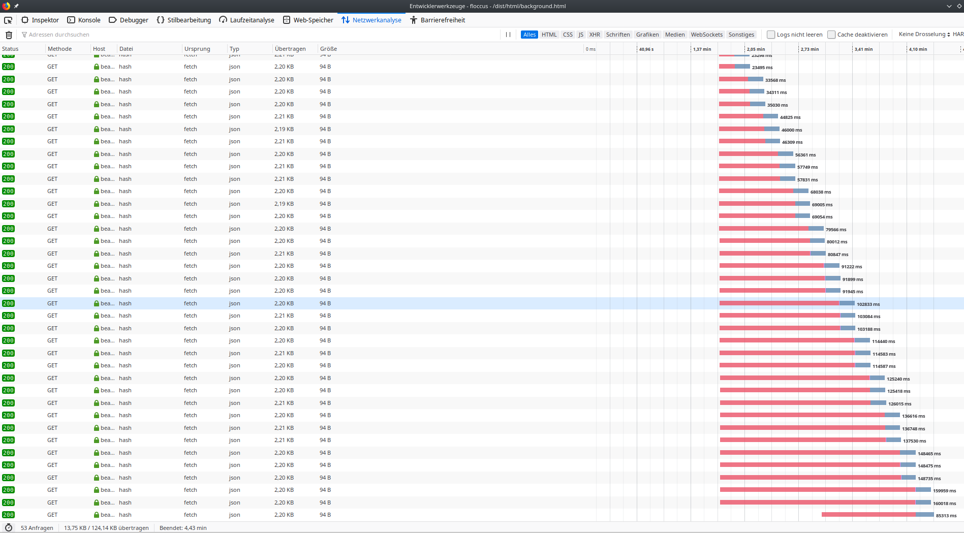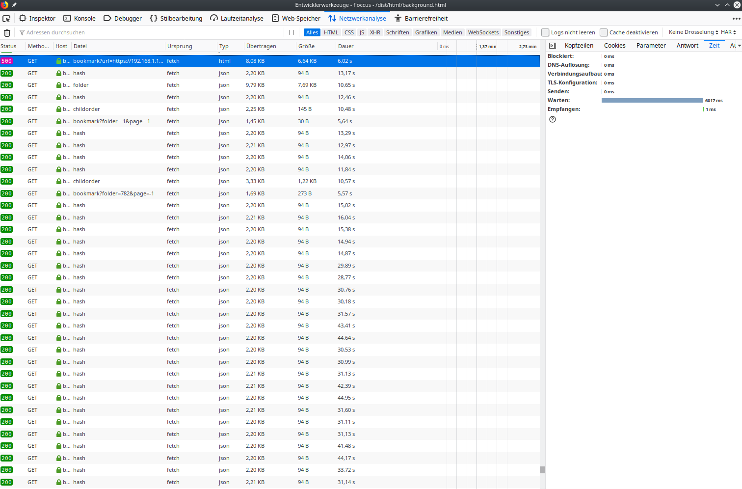 Zunächst wäre es interessant herauszufinden, welcher Request timeoutet. Dazu kannst du die folgenden Schritte machen, um die Netzwerkkommunikation zu beobachten: