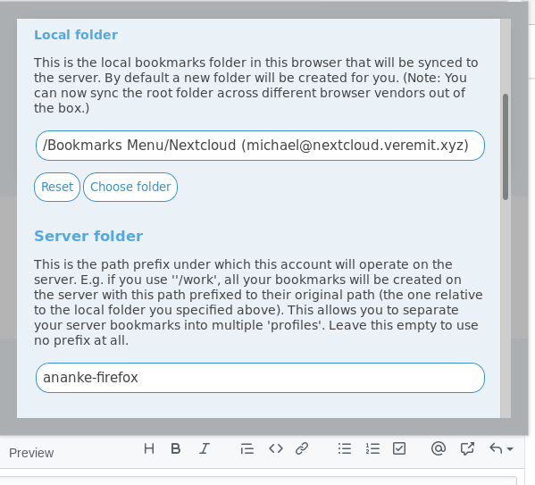 Existing bookmarks folders are replicated to the Nextcloud server, and are visible in the web interface as children of a new parent folder pertaining to this computer/setup.