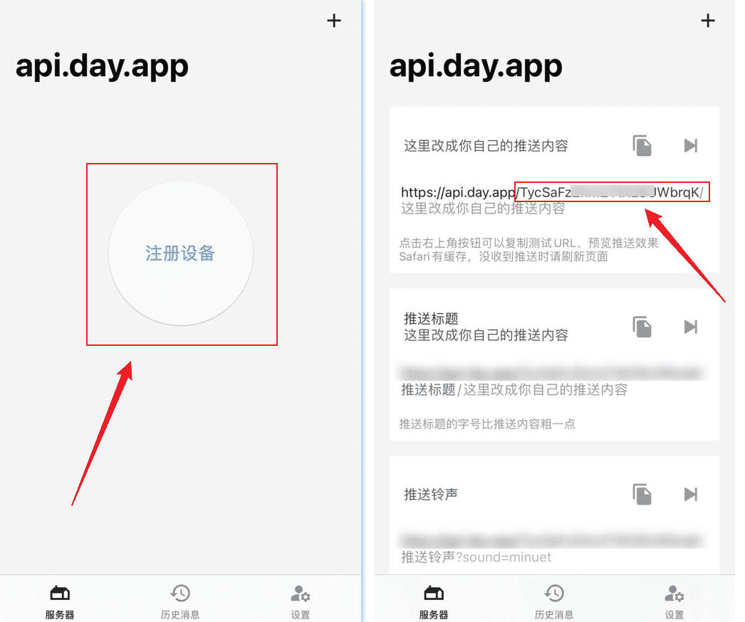 2、打开Bark app,点击注册设备,记得允许通知,然后就可以看到,右边红框中两个/之间的字符便是你的BARK_KEY,请将.env文件中的BARK_KEY的值设为此处获取的值