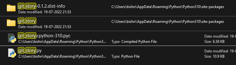 site-packagesfolder contains the Python module, but the install process should also have created an executable file somewhere calledgit-story. That's what I was trying to ask about. Can you search your PC for a file called "git-story"? On Windows it is probably "git-story.exe".I'm guessing it was created somewhere that is not on your