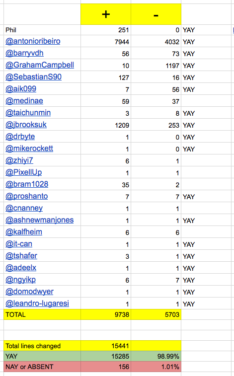 We need at least 95% of all contributors/contributions to make this change, but we have only, so if @GrahamCampbell gives us his AYE, we should be good to go: