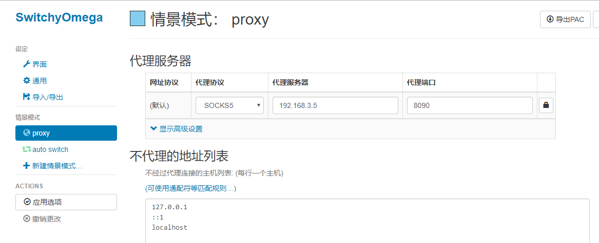 浏览器chrome+SwitchyOmega 代理参数配置 socks5 192.168.3.5:8080
