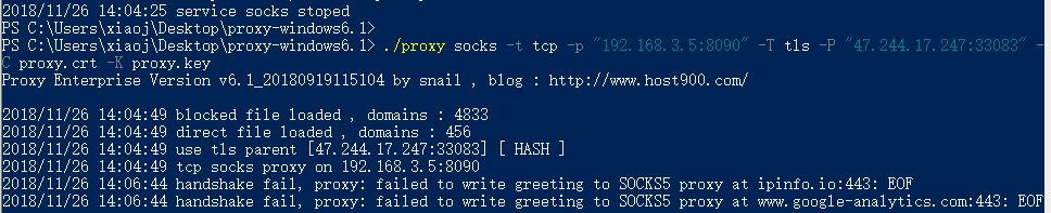 启动命令 : ./proxy socks -t tcp -p "192.168.3.5:8080" -T tls -P "47.244.17.247:33083" -