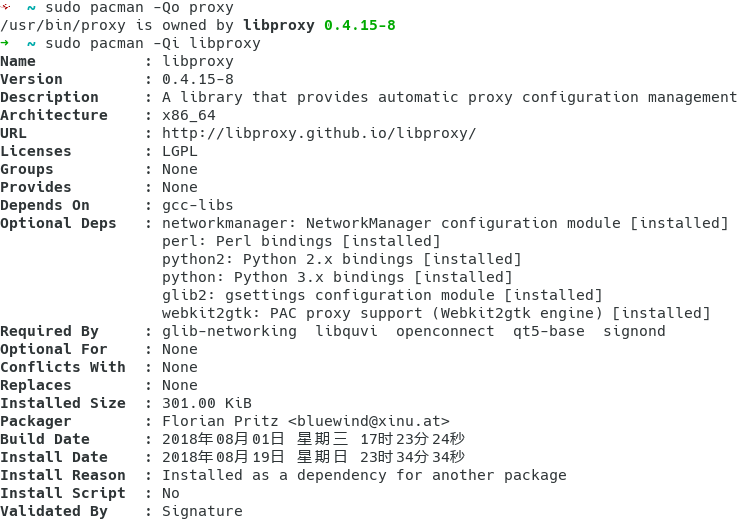 As we can see, the binary named proxy is own by a package named libproxy which is required by "glib-networking, libquvi, openconnect, and other packages.
