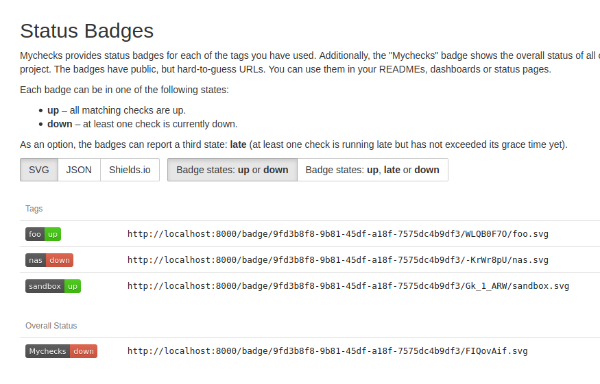 /startin a very simple and limited way: store a "last_start" timestamp, and use it to calculate execution time on finish. And nothing more – don't display a "started" status in dashboard, don't interfere with badges, don't send an alert if/startisn't followed by a regular ping on time. Of course it's too late now to change that, and drop features. Also, I suspect, if Healthchecks had just this simple version, there would be feature requests to show the "started" status in dashboard, and to send alerts when a started check is hanging for too long.I do agree that an orange "late" badge for started checks is not ideal: it is more likely to be interpreted as "we have a small problem" instead of "all is well for now, but one or more checks may or may not go down soon".