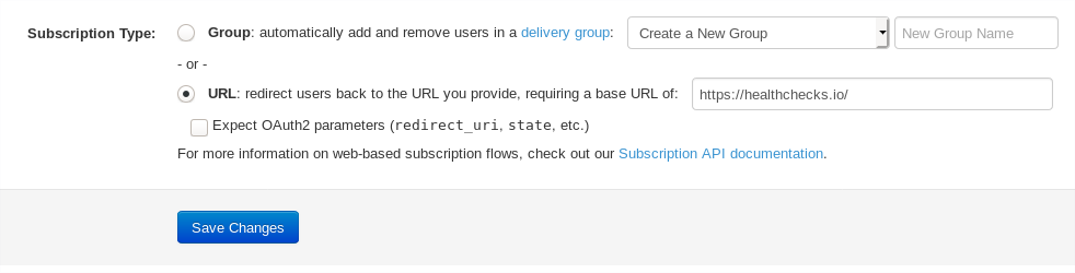 https://pushover.net/subscribe/MyHCAppName-RandomKeys?success=http%3A%2F%2Fredacted%2Fintegrations%2Fadd_pushover%2F%3Fstate%3DRandomChars%26prio%3D0%26prio_up%3D0&failure=http%3A%2F%2Fredacted%2Fintegrations%2FOn opening Healthchecks, it prompts me to subscribe to the app, on clicking 'subscribe me' I get redirected to https://pushover.net/ which renders my landing dashboard (app list, api keys, settings etc)