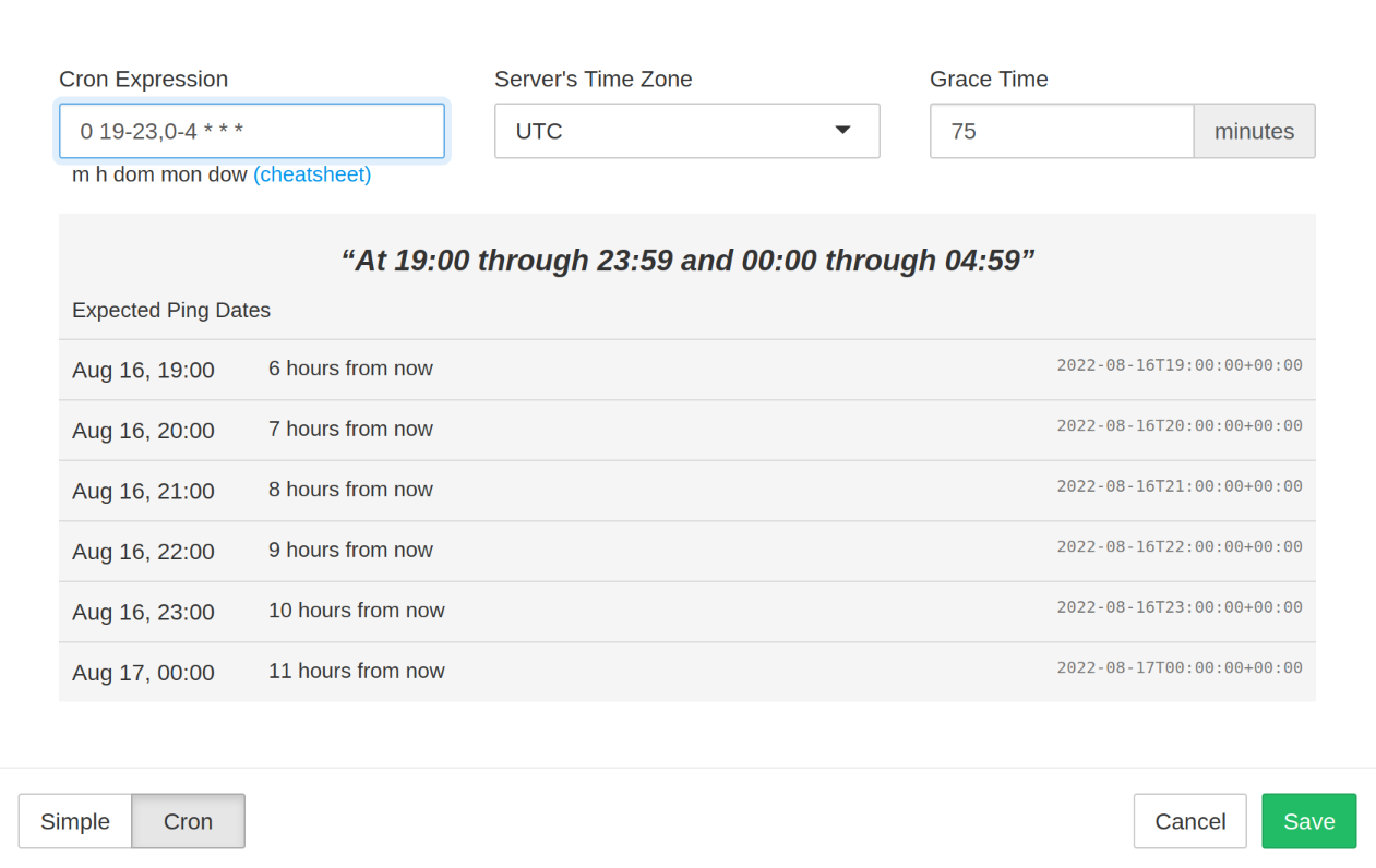 0 19-23,0-4 * * *says: expect a ping at the start of every hour, from 19:00 until 05:00 (exclusive).@DarrenPIngram commented on GitHub (Aug 16, 2022):