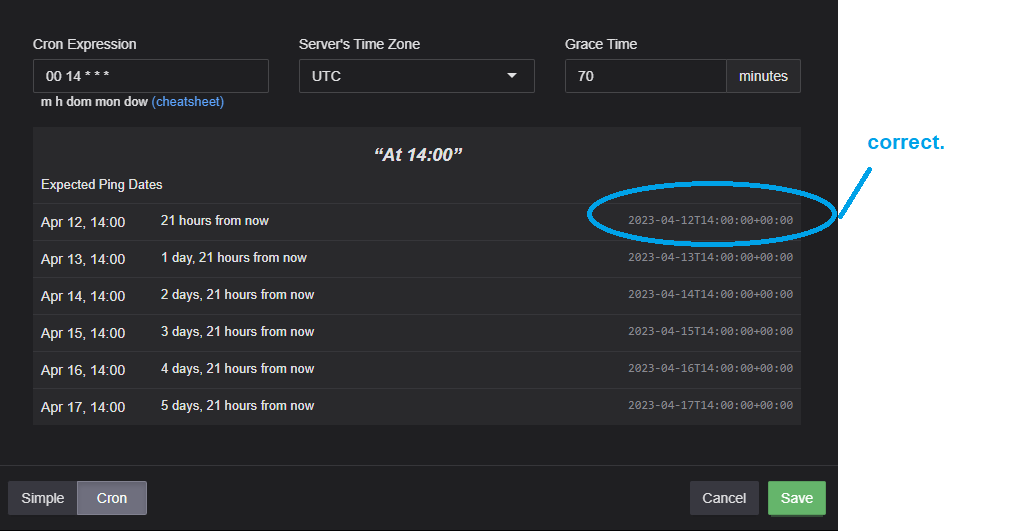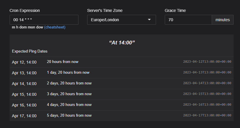 I've just set the timezone of the container to Etc/UTC and left the cron job set to UTC in healthchecks and it all displays the same as above. Exactly the same. . Could it be that wherever this page is getting it's time recieved from it only ever shows the recieved time as UTC? I can't set anything anywhere it seems to make the screenshot below not show as +00:00