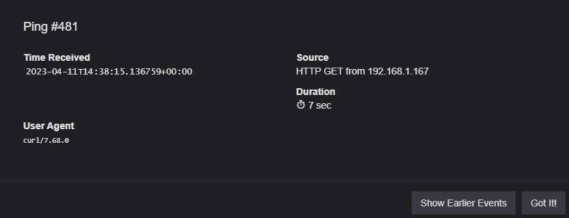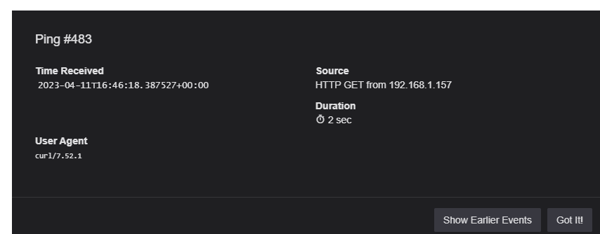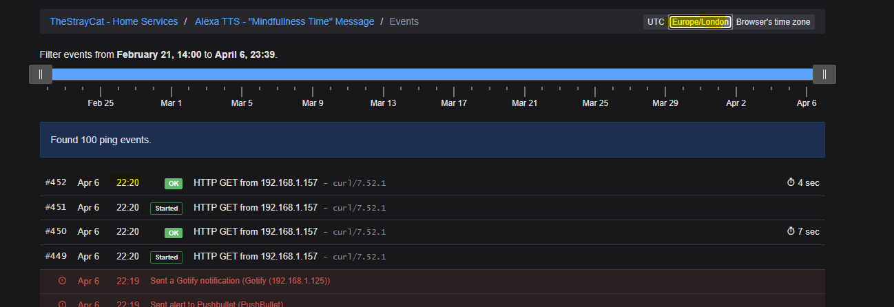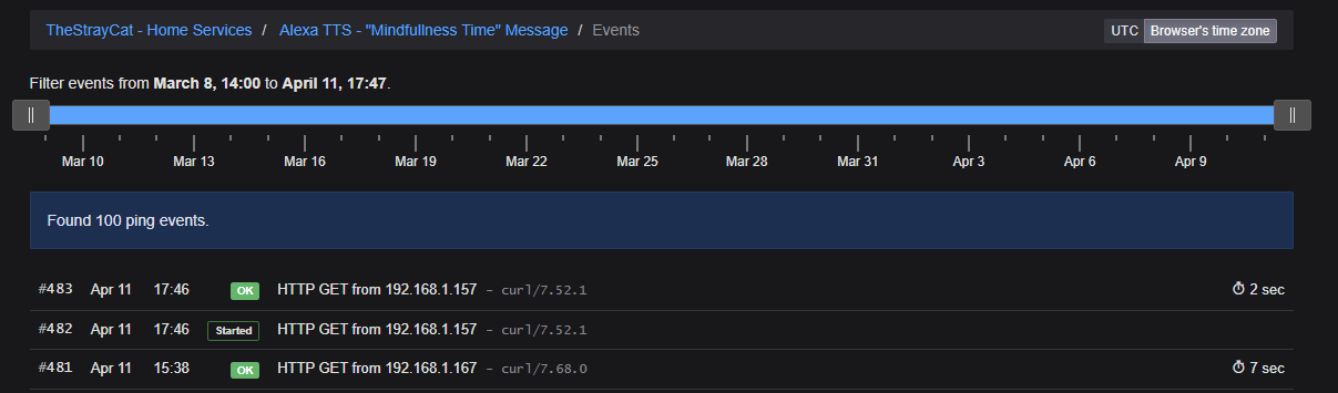 However if i click on the "Show Earlier events button on that same screenshot. It shows the correct time of 17:46pm for ping #483. Makes no sense. That hour difference means all my checks fails. One sceens says one thing, the next screen says something else.
