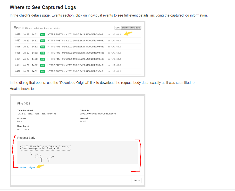 attach log: https://healthchecks.io/docs/attaching_logs/