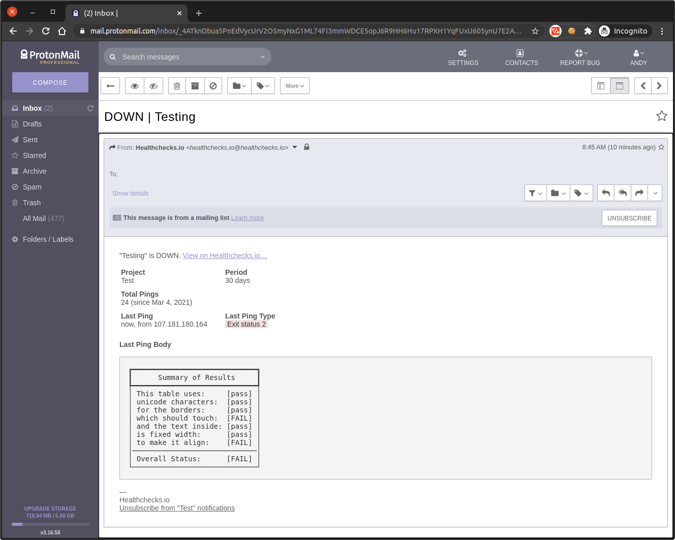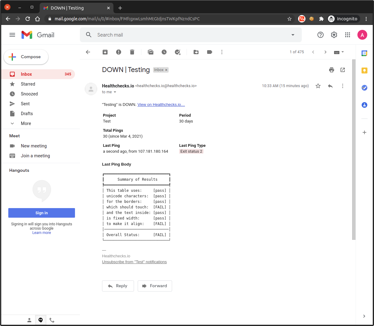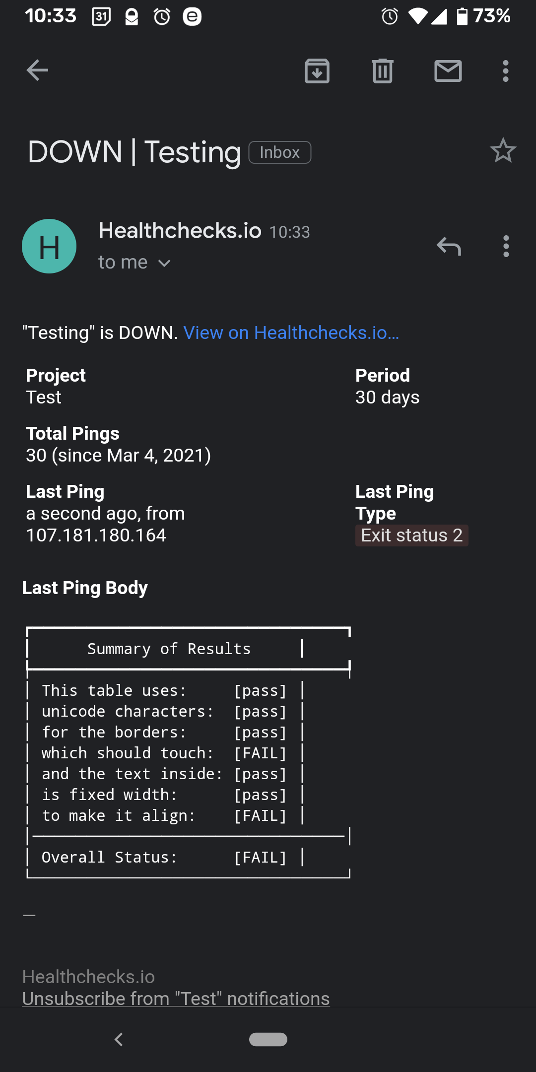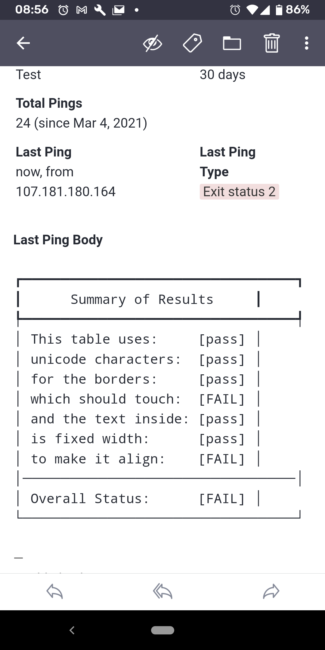 ping.bodycontents uniformly. Even using different applications from the same email provider results in a different display of theping.bodycontents. There are two basic issues:<pre>tags. Using fixed-width font is listed in the definition on https://www.w3schools.com/tags/tag_pre.asp9fd9c8e4efbut is not part of the definition of the<pre>tag. I'd like to add this to the emails to make Healthchecks more uniform between the website and the email notification.Gmail Webmail: