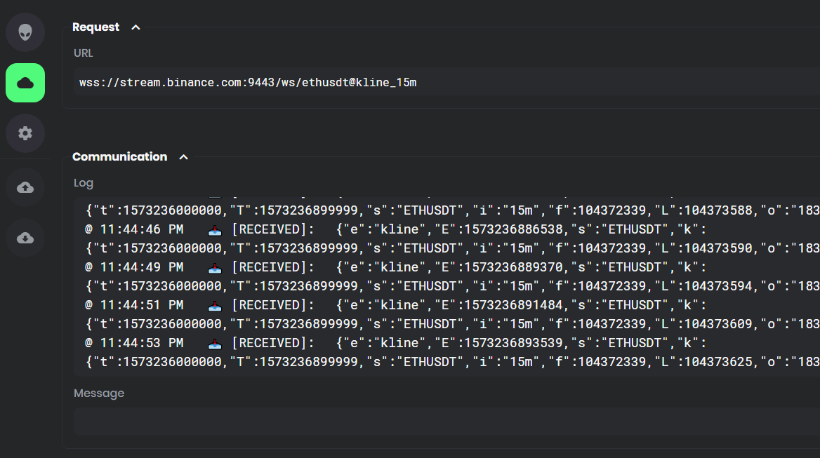 I've tried to utilize the Websocket client to request some data to Binance Exchange API, using the URI shown below: