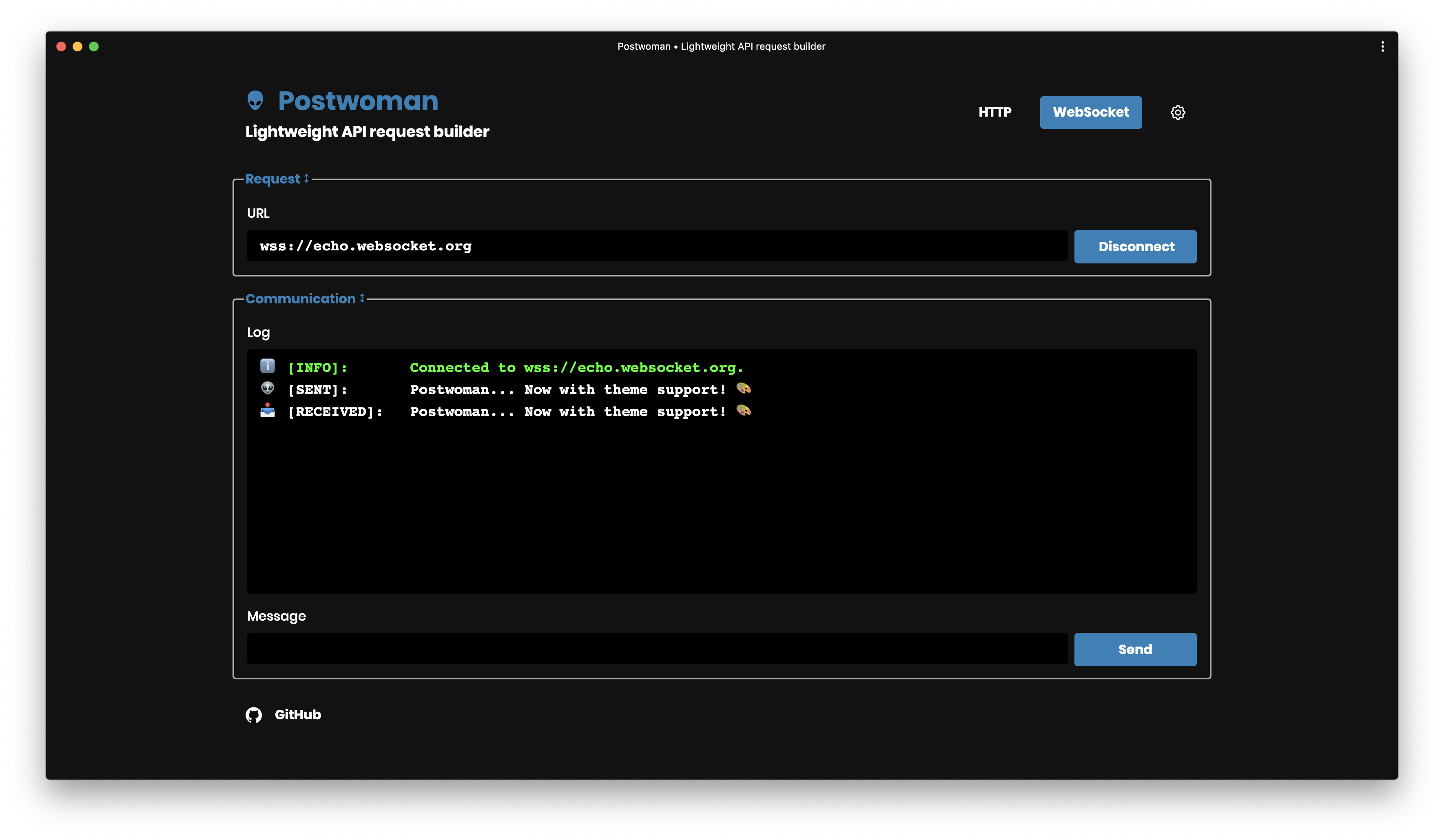35d7e1b🔌 Add websocket page37ed800Merge pull request #1 from NBTX/feat/websocket67f0600Improve mobile navigation02ef69f🎨 Add theme support4d238b8Merge branch 'master' of github.com:NBTX/postwoman-vued66fadeMerge branch 'master' of https://github.com/liyasthomas/postwoman0571ec7Merge branch 'master' of https://github.com/liyasthomas/postwomanbd434ffImprove URL validation check. (See https://github.com/liyasthomas/postwoman/issues/56)📊 Changes