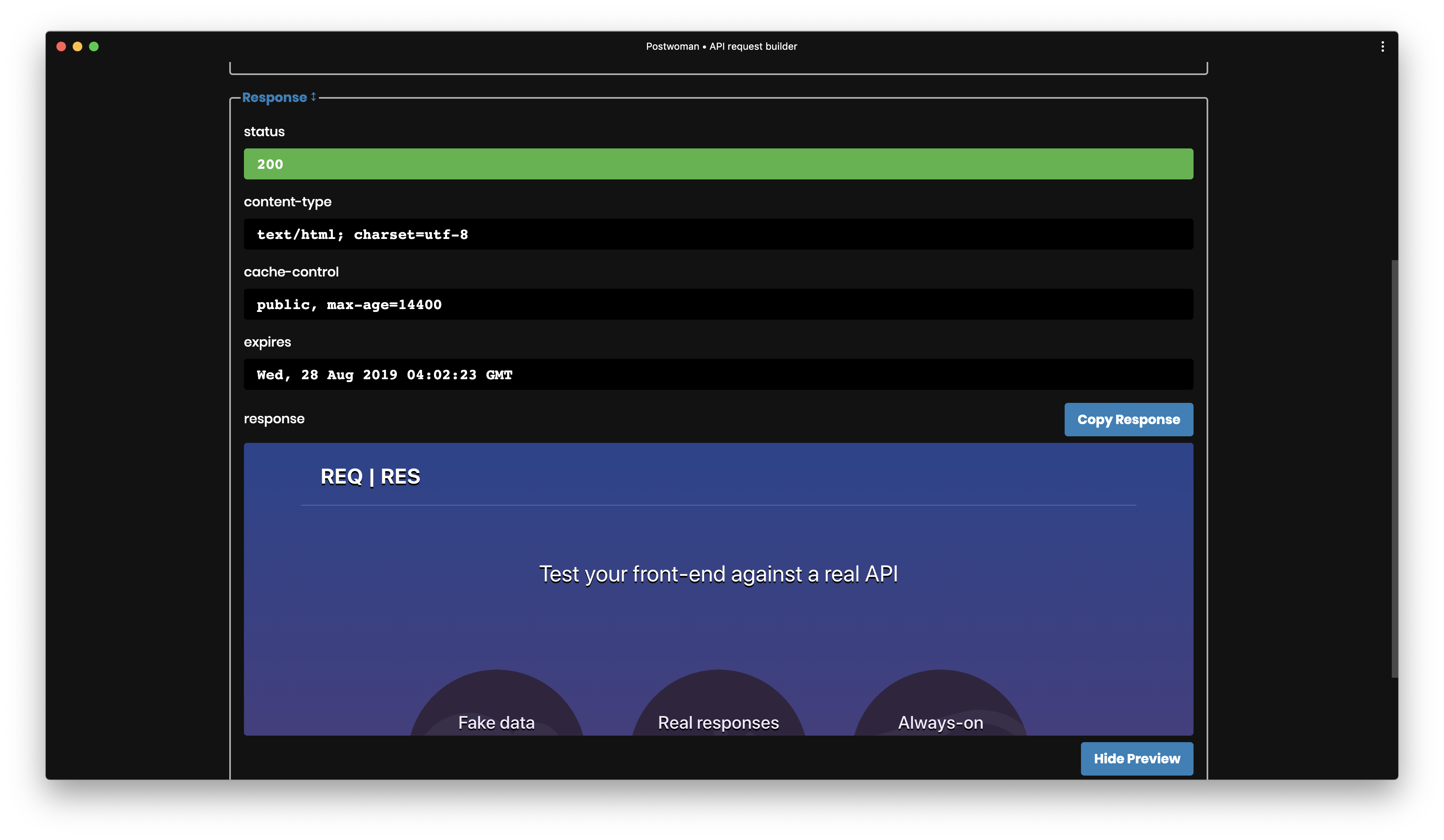 8912004Adds HTML preview, solves https://github.com/liyasthomas/postwoman/issues/4138f6f4eClose preview when a new request is made📊 Changes