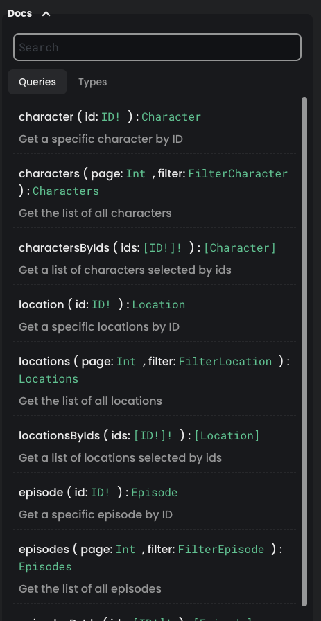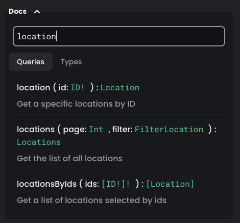 queryFields,mutationFields,subscriptionFieldsandgqlTypes.The value provided to the search input is used to match on