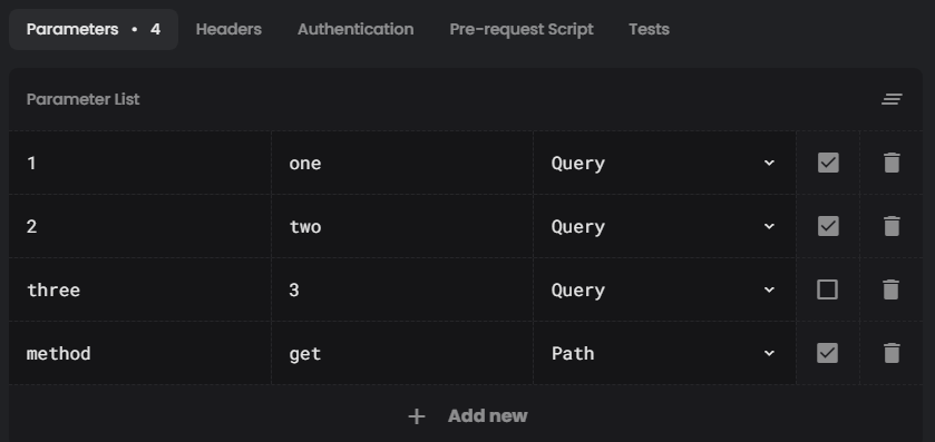 active: true(default: true) in:paramsheadersbodyParamschecks